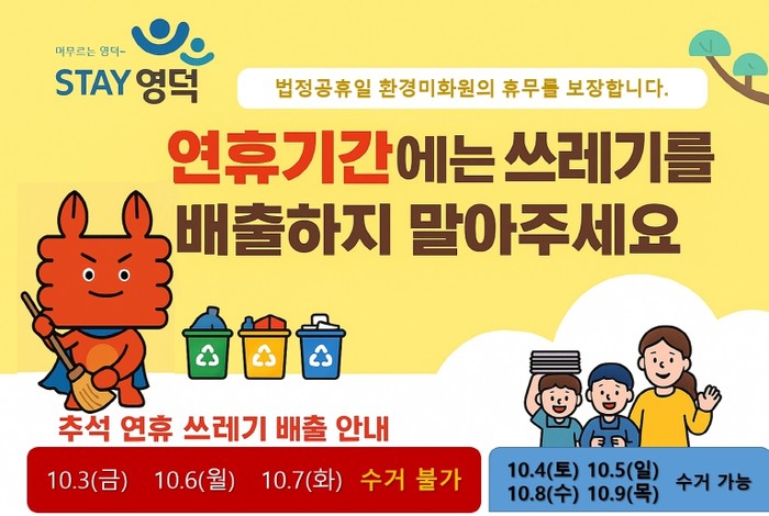 김신규 환경위생과장은 “추석 당일 전에 생활 쓰레기를 미리 배출하고, 추석 연휴 동안에는 다음날인 7일 저녁부터 쓰레기를 배출해 달라”라고 당부했다.
