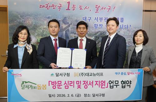 [파이낸셜경제=김지훈 기자] 대구 달서구는 지난 6일, 2026년 ‘지역사회 통합돌봄’ 본사업의 성공적인 시행을 위해 어르신 심리·정서(인지) 케어 전문기관인 대교뉴이프와 업무협약을 체결하고,‘달서형 지역특화 통합돌봄 사업’을 선제적으로 추진한다.