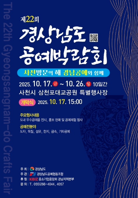 [파이낸셜경제=김예빈 기자] 경상남도는 10월 17일부터 26일까지 10일간 사천시 삼천포대교공원 특별행사장에서 ‘제22회 경남 공예박람회’를 개최한다고 밝혔다.