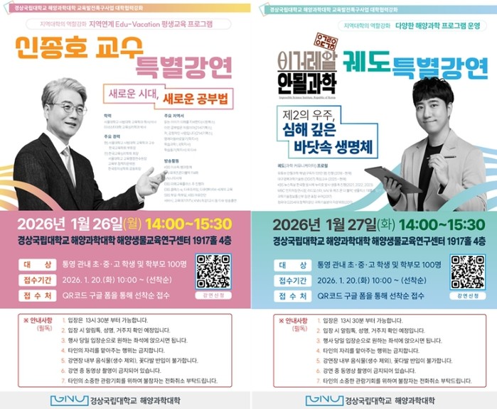 두 강연 모두 경상국립대학교 해양과학대학(통영캠퍼스) 해양생물교육연구센터 4층 1917홀에서 열린다.