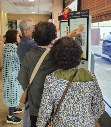 | ▲ 밀양시 삼문동 맥도날드 밀양DT점에서 열린 디지털 키오스크 문해교육 현장실습에 참여한 학습자들이 키오스크를 직접 조작하며 주문을 연습하고 있다. |