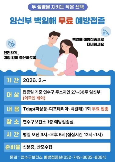 접종 대상은 접종일 기준 연수구에 주소를 둔 임신 27주~36주 임신부(외국인 제외)로, 연수구보건소에서 파상풍-디프테리아-백일해(Tdap) 백신을 무료로 1회 접종받을 수 있다.