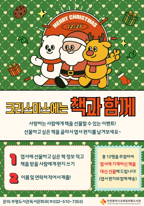 [파이낸셜경제=김기보 기자] 인천광역시교육청부평도서관은 지역 서점과 협력한 책동네산책 프로젝트의 일환으로 ‘크리스마스에는 책과 함께’ 이벤트를 12월 14일까지 운영한다고 밝혔다.