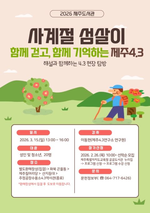 제주도서관 관계자는 “현장에서 직접 듣는 역사 해설을 통해 4.3이 남긴 교훈을 다시금 되새기는 시간이 되길 바란다”며 도민들의 많은 참여를 당부했다.