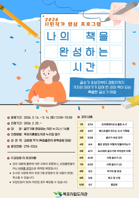 [파이낸셜경제=김예빈 기자] 목포시립도서관은 인공지능(AI) 기술 확산과 정보 과잉 환경 속에서 시민들의 사고력과 표현력을 높이기 위해 시민작가 양성 과정 ‘나의 책을 완성하는 시간’을 운영한다.