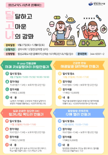 [파이낸셜경제=조성환 기자] 횡성교육도서관은 9월 27일, 10월 25일, 11월 22일, 12월 6일 4회에 걸쳐 가족과 함께하는 하반기 ‘달달하고 고마운 나의’ 강좌를 운영한다.