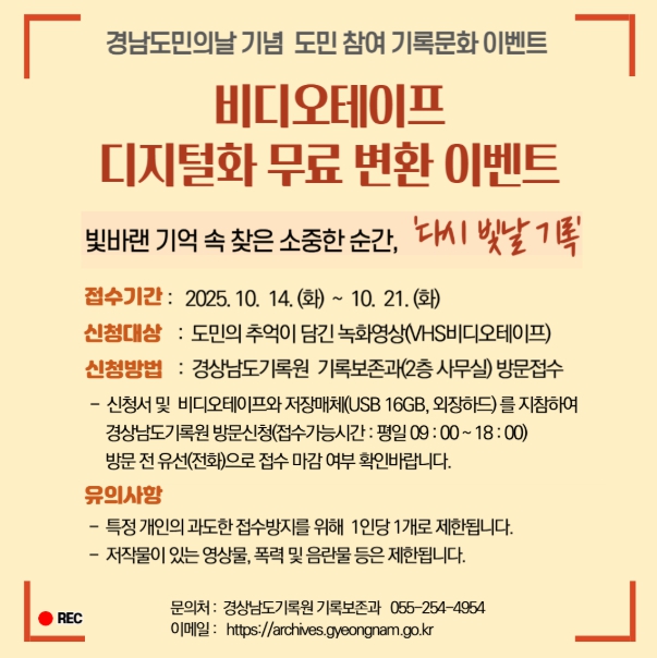 [파이낸셜경제=김예빈 기자] 경상남도기록원은 10월 14일부터 31일까지 도민이 소중한 추억을 오래도록 보존할 수 있도록 '빛바랜 기록 속 찾은 소중한 순간 – 다시 빛날 기록'이라는 주제로 비디오테이프 디지털 변환 이벤트를 추진한다고 밝혔다.