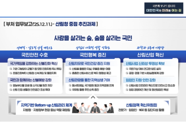 [파이낸셜경제=김영란 기자] 산림청은 ‘정부 업무보고’를 계기로 ‘사람을 살리는 숲, 숲을 살리는 국민’ 실현을 위한 중점 추진과제를 11일 발표했다.