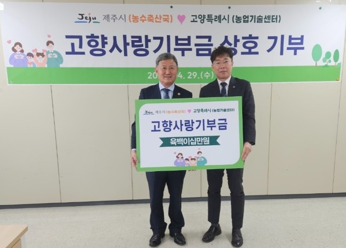 이날 전달식에서는 제주시 농수축산국과 고양특례시 농업기술센터 직원들의 자발적인 참여로 마련한 고향사랑기부금 620만 원씩을 상호 전달하고, 양 지역의 발전을 함께 응원했다.