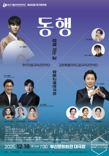 [파이낸셜경제=박영진 기자] 부산시립국악관현악단(예술감독 이동훈)의 제233회 정기연주회가 다가오는 12월 18 오후 7시 30분, 부산문화회관 대극장에서 강원특별자치도립국악관현악단 합동교류연주회가 '함께 가는 길, 동행'이라는 부제로 개최된다.