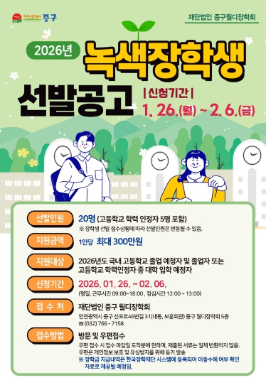 [파이낸셜경제=김기보 기자] 재단법인 인천 중구월디장학회(이사장 김정헌)는 지역 인재 육성을 위해 ‘2026년도 녹색 장학생’ 대상자를 모집한다고 20일 밝혔다.