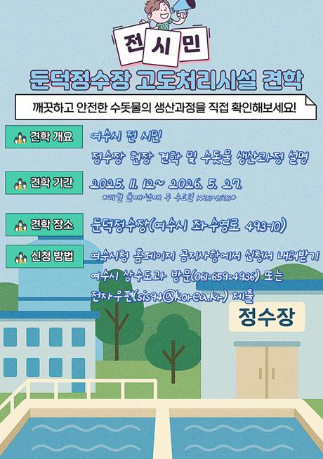 시 관계자는 “여수시는 최첨단 정수 시스템을 바탕으로 1a등급의 수질을 유지하고 있다”며 “이번 견학을 통해 시민들이 직접 ‘맑은 물 생산 현장’을 볼 수 있도록 지속 홍보하고 수도행정에 대한 시민 신뢰를 더욱 높여가겠다”고 말했다.