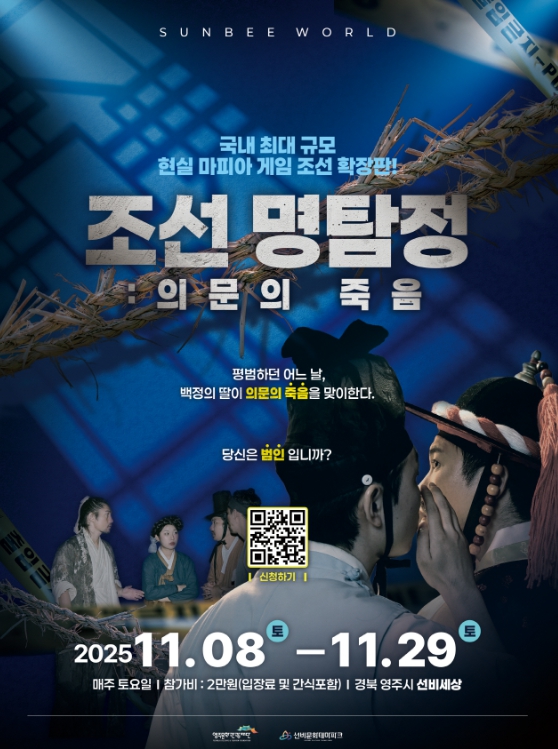 [파이낸셜경제=김지훈 기자] 영주시 선비세상에서 오는 11월 8일부터 매주 토요일, 참가자가 직접 조선시대 인물이 되어 연쇄 살인 사건의 진실을 밝혀야 하는 국내 최대 규모 체험형 마피아 게임 ‘조선명탐정: 의문의 죽음’이 개최된다.