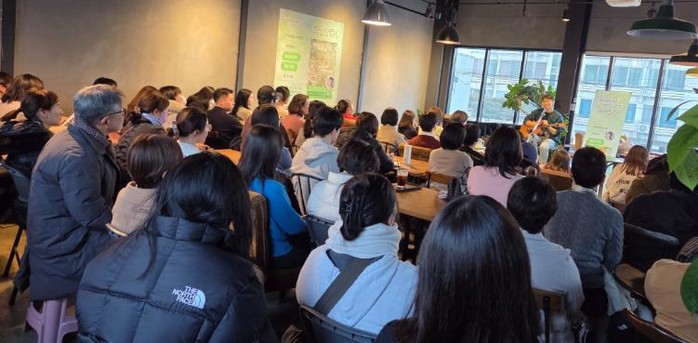 이번 행사는 인디밴드 브로콜리너마저의 보컬이자 에세이 ‘열심히 대충 쓰는 사람’의 저자인 싱어송라이터 윤덕원을 초청해 북토크와 기타 라이브 공연을 함께 진행했다.