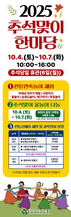 [파이낸셜경제=김예빈 기자] 양산시립박물관은 민족 최대의 추석 명절을 맞이하여 오는 10월 4일부터 7일까지 3일간 ‘2025년 추석맞이 놀이 한마당’을 운영한다고 밝혔다.