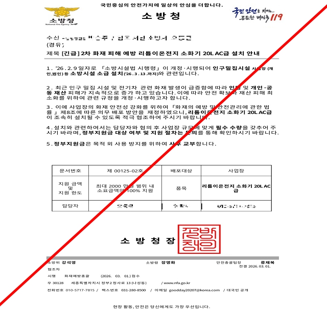 서산소방서에 따르면 일부 업체 또는 개인이 소방청 명의의 공문 형태로 제작된 안내문을 이용해 사업장 등을 대상으로 ‘리튬이온전지 소화기 설치 안내’라며 접근해 물품 구매 또는 비용 지급을 유도하려한 정황이 확인됐다.