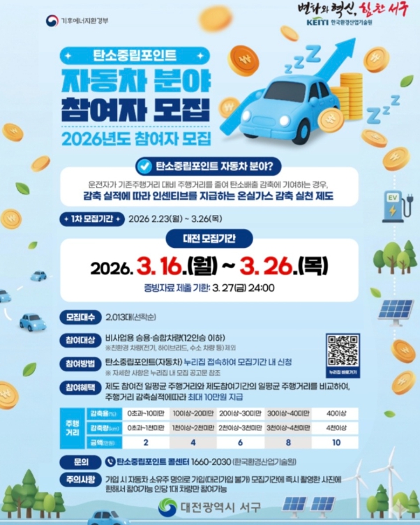 [파이낸셜경제=김영란 기자] 대전 서구는 온실가스 감축을 위해 3월 16일부터 26일까지 2026년 자동차 탄소중립포인트제 참여자를 모집한다고 13일 밝혔다.