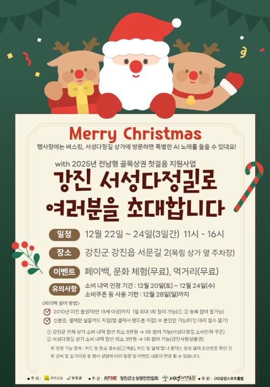 [파이낸셜경제=김예빈 기자] 강진군이 오는 22일부터 24일까지 3일간 서성다정길 골목형상점가 구역 일대에서 연말 분위기를 가득 담은 크리스마스 특별행사를 개최한다.