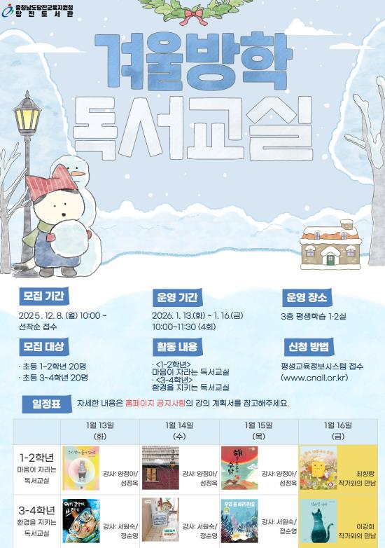 이번 겨울독서교실은 당진 지역 초등 1~4학년을 대상으로 하며, 2026년 1월 13일부터 16일까지 4일간 운영된다.