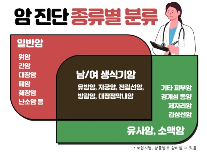 일반적으로 보험사에서 암을 구분할 때에는 일반암, 유사암, 소액암, 고액암 등으로 분류를 하고 있다. 유사암은 보통 경계성종양, 제자리암, 갑상선암, 기타피부암이 해당되고 소액암은 유방암, 방광암, 전립선암, 자궁암이 해당된다. 그리고 고액암은 뼈암이나 뇌암, 췌장암 등이 해당되며 이들을 제외한 나머지 암을 일반암으로 분류한다. 보통 치료비가 많이 드는 고액암이 다른 암보다 진단금이 높은 편이지만, 폭넓은 보장을 위해서는 일반암 진단비를 늘리는 것이 유리하다. 또한, 유사암이나 소액암은 비교적 치료가 간단하고 비용도 적게 들지만 발생빈도가 높은 관계로 보통 일반암 진단비의 10%~20% 정도만 지급되므로 사전에 보장금액을 살펴볼 필요가 있다.