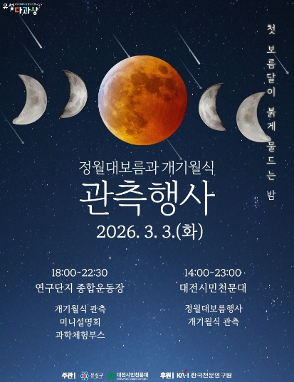 [파이낸셜경제=김영란 기자] 대전 유성구는 3월 3일 대덕연구단지 운동장에서 대전시민천문대(대장 최형빈)와 함께 ‘2026 정월대보름 및 개기월식’ 행사를 개최한다.