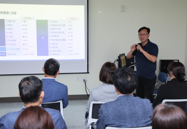 이날 강의에서 강연자인 강호진 대표는 “국정과제의 큰 줄기는 ①AI, ②에너지 대전환, ③5극 3특”이라는 견해를 밝히면서, “앞으로의 시정 방향은 해당 분야에 정책 자원과 국비 확보 역량을 집중하는 것”이라는 의견을 제시했다.
