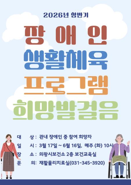 [파이낸셜경제=김기보 기자] 의왕시 보건소가 지역 내 장애인의 건강관리 및 재활 의지 향상을 위해 운영되는 2026년 상반기 장애인 생활체육 프로그램 '희망발걸음'의 참여자를 모집한다.