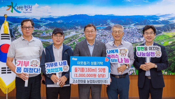 [파이낸셜경제=김예빈 기자] 고소한마을 농업회사법인(대표 하성목)은 9월 22일 합천군청을 방문해 이웃돕기 성품으로 100만원 상당의 들기름 50병을 합천군에 기탁했다.