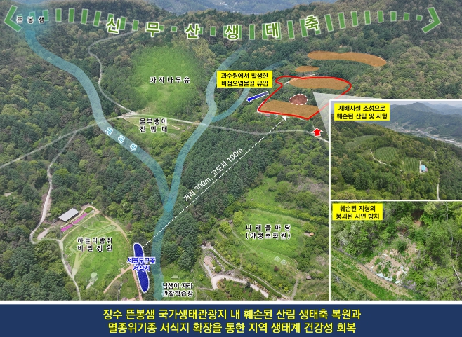 장수군은 이번에 확보한 국비 4억5천만 원을 활용해 뜬봉샘 국가생태관광지 내 과거 개간사업으로 조성된 폐과수원 일원을 중심으로 훼손된 산림과 지형을 복원하고 단절된 산림 생태축을 회복할 계획이다.