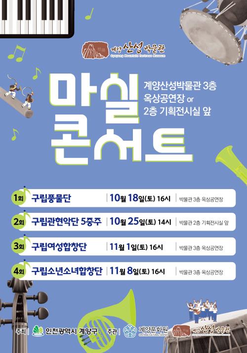 구 관계자는 “마실콘서트는 일상 가까이에서 음악을 통해 힐링할 수 있는 주민 친화형 문화행사로, 계양산의 가을과 함께 감동을 느낄 수 있는 특별한 시간이 되길 바란다.”라고 전했다.