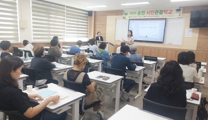 | ▲ 순천 시민관광학교에 참여한 시민들이 치유분야 강좌를 듣고 있다. |