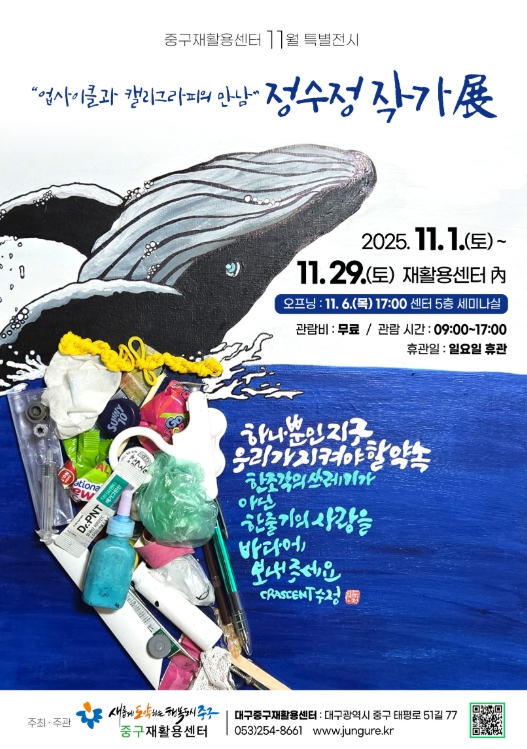 [파이낸셜경제=김지훈 기자] 대구 중구는 11월 1일부터 11월 29일까지 중구재활용센터에서 ‘업사이클과 캘리그라피의 만남’을 주제로 한 정수정 작가 초대전을 개최한다.