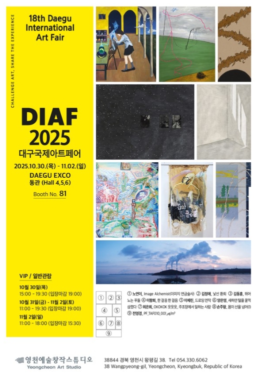 [파이낸셜경제=김지훈 기자] 영천예술창작스튜디오는 30일 프리뷰를 시작으로 11월 2일까지 4일간, 대구 엑스코 동관(홀 4·5·6)에서 열리는 ‘대구국제아트페어 2025(DIAF 2025)’에 17기 입주작가 9명의 작품 29점을 출품한다.