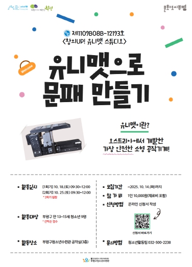 [파이낸셜경제=김기보 기자] 부평구 청소년수련관은 오는 14일까지 부평 내 14~16세 청소년을 대상으로 ‘창의 UP! 유니맷 스튜디오!’ 참가자를 모집한다.