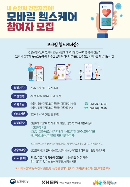 [파이낸셜경제=김예빈 기자] 순천시는 ICT 기반 공공형 건강관리서비스인 ‘2026년 보건소 모바일 헬스케어 사업’ 참여자를 모집한다고 밝혔다.