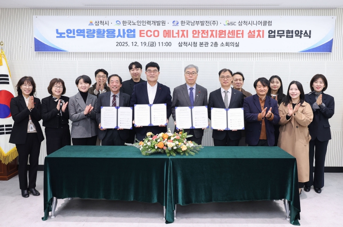 [파이낸셜경제=조성환 기자] 삼척시는 12월 19일 한국노인인력개발원, 한국남부발전(주) 삼척빛드림본부, 삼척시니어클럽과 함께 신규 어르신 일자리 창출사업으로 ‘Eco에너지 안전지원센터’ 운영을 위한 업무협약을 체결했다.