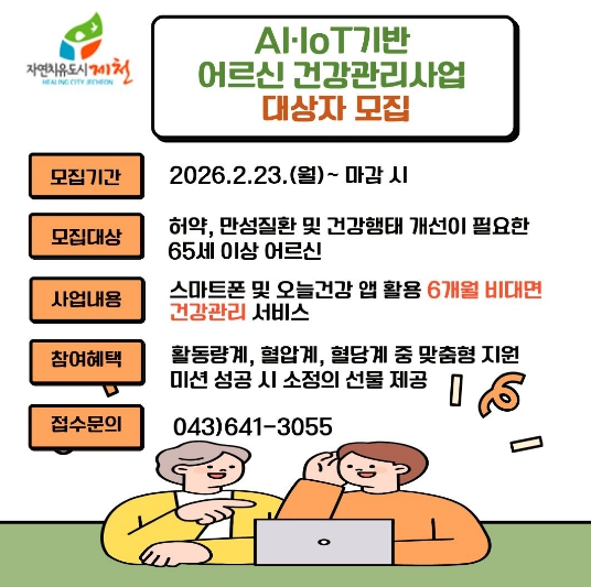 [파이낸셜경제=김기보 기자] 제천시보건소(소장 안순덕)는 인공지능(AI)과 사물인터넷(IoT) 기술을 활용해 어르신들의 만성질환을 체계적으로 관리하는‘AI·IoT 기반 어르신 건강관리사업’참여자를 오는 23일부터 모집한다.