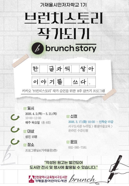 [파이낸셜경제=김기보 기자] 인천광역시교육청서구도서관은 17일부터, 예비 작가들의 꿈을 지원하기 위한 시민저자학교 1기 ‘브런치스토리 작가되기’ 프로그램 참여자를 모집한다.