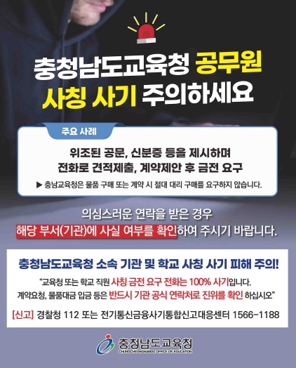 | ▲ 충남교육청, 교육청과 학교 교직원 사칭 허위 계약 금전 피해 '주의보' 발령 |