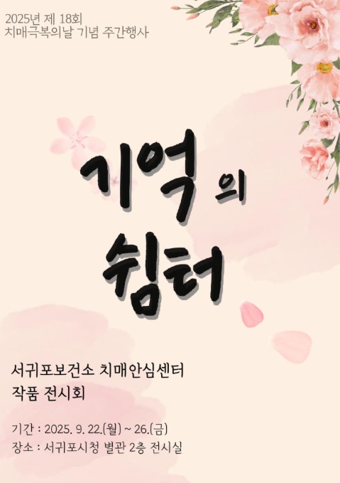 [파이낸셜경제=김영란 기자] 서귀포보건소 치매안심센터는 2025년 제18회 치매극복의 날을 맞아 9월 22일부터 26일까지 서귀포시청 1청사 별관 전시실에서 '기억의 쉼터' 작품전시회를 진행한다고 밝혔다.