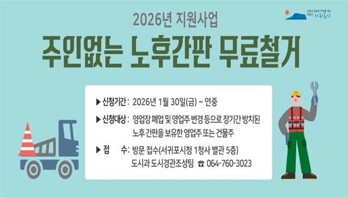 [파이낸셜경제=김영란 기자] 서귀포시는 안전하고 쾌적한 도시경관 조성 및 소상공인의 경영 안정을 도모하기 위해 30일부터 ‘2026년 주인없는 노후간판 무료철거 지원사업’ 대상자를 연중 모집한다.