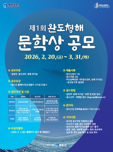 [파이낸셜경제=김예빈 기자] ‘치유의 섬’ 완도군에서는 많은 사람들이 문학의 향기로 마음을 치유할 수 있도록 ‘제1회 완도 청해 문학상’ 공모전을 연다.