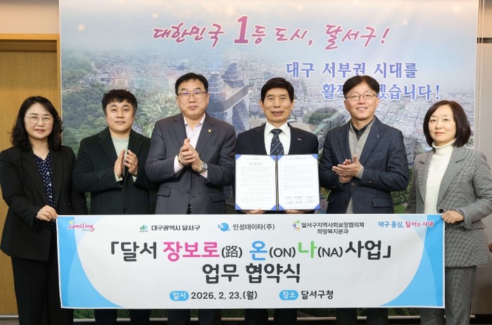 [파이낸셜경제=김지훈 기자] 대구 달서구는 23일 인성데이타(주)(대표 최현환), 달서구지역사회보장협의체 희망복지분과(분과장 최안집)와 함께 거동이 불편한 중장년 1인 장애인 세대 등을 대상으로 온라인 장보기 지원을 위한 업무협약을 체결했다.