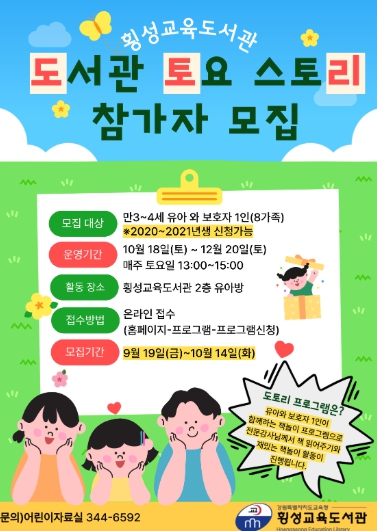 [파이낸셜경제=조성환 기자] 횡성교육도서관은 10월 18일부터 12월 20일까지 10회에 걸쳐 ‘유아 책 놀이 프로그램인 도토리(도서관 토요 스토리)’를 운영한다고 밝혔다.