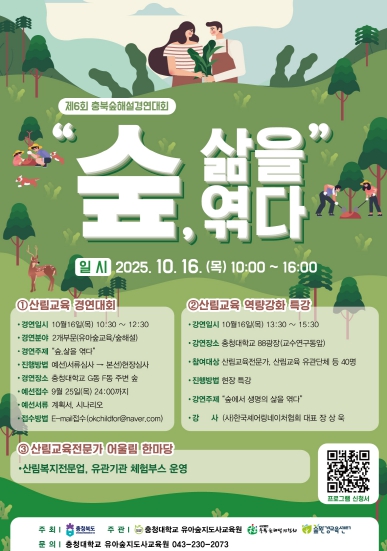 이번 숲해설 경연대회는 충북도가 주최하고, 산림교육전문가 양성기관(충청대학교 유아숲지도사교육원, 충북숲해설가협회, 숲환경교육센터)이 공동 주관해 도민들의 참여와 관심을 유도하고자 ‘숲, 삶을 엮다’라는 주제로 숲과 사람, 지역이 함께 어우러지는 숲 문화 축제로 펼쳐진다.