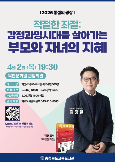 강연은 4월 2일 19시 30분, 옥천문화원 관성회관에서 진행되며, 학생, 학부모, 교직원, 지역주민 등 누구나 신청할 수 있다. 강연 신청은 3월 3일 오전 10시부터 3월 25일 오후 5시까지 충청북도교육도서관 누리집을 통해 가능하다.