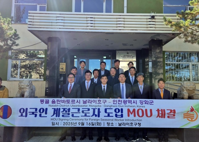 [파이낸셜경제=김기보 기자] 강화군은 지난 16일, 몽골 울란바토르시 날라이흐구를 공식 방문해 ‘외국인 계절근로자 도입에 관한 협약(MOU)’을 체결했다고 밝혔다.