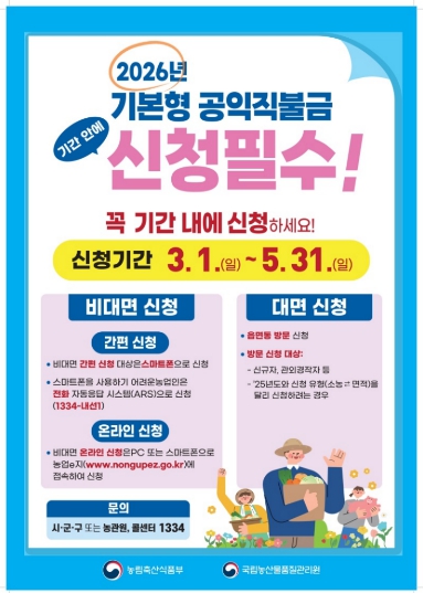 [파이낸셜경제=김기보 기자] 인천광역시 계양구는 2026년도 기본형 공익직불금 등록 신청을 오는 3월 1일부터 5월 31일까지 접수한다고 밝혔다.