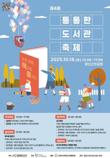 [파이낸셜경제=김기보 기자] 인천 서구 구립도서관(검암·단봉늘봄·검단·심곡·석남·신석 도서관)이 오는 18일 원신근린공원에서 ‘제4회 통통한 도서관 축제’를 개최한다.