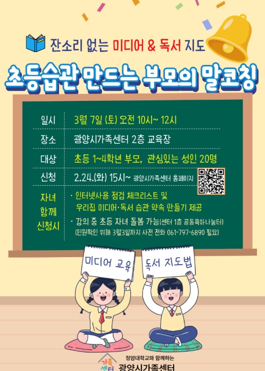 첫 교육은 학령기 부모를 대상으로 한 ‘잔소리 없는 미디어·독서지도-초등습관을 만드는 부모의 말 코칭’으로 진행된다.